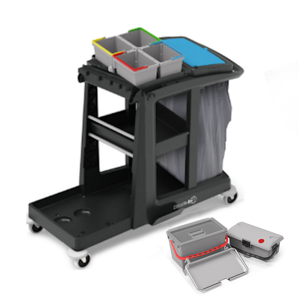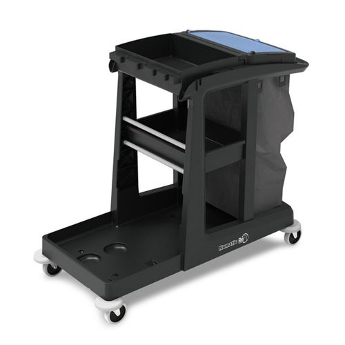 Duży wózek do sprzątania EM3 SRK17 SRK21 angielskiej marki NUMATIC przeznaczony jest do wielofunkcyjnej pomocy w czyszczeniu małych powierzchni. Wyposażony jest w zestaw wiader do dezynfekcji, 3 wygodne półki z praktycznymi akcesoriami a także uchwyt na śmieci z pokrywą do worków 120L lub 2x70L. Wózek doskonale sprawdza się w niewielkich pomieszczeniach o ograniczonej dostępności np. w wąskich korytarzach.