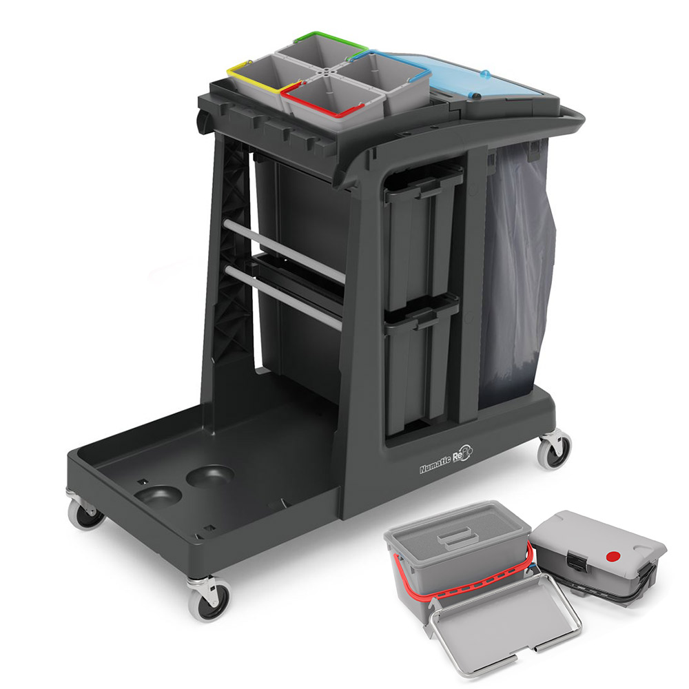 Duży wózek do sprzątania EM5 SRK17 SRK21 angielskiej marki NUMATIC przeznaczony jest do wielofunkcyjnej pomocy w czyszczeniu małych powierzchni. Wyposażony jest w zestaw wiader do dezynfekcji, 2 wysuwane kuwety, a także uchwyt na śmieci z pokrywą do worków 120L lub 2x70L. Wózek doskonale sprawdza się w niewielkich pomieszczeniach o ograniczonej dostępności np. w wąskich korytarzach.
