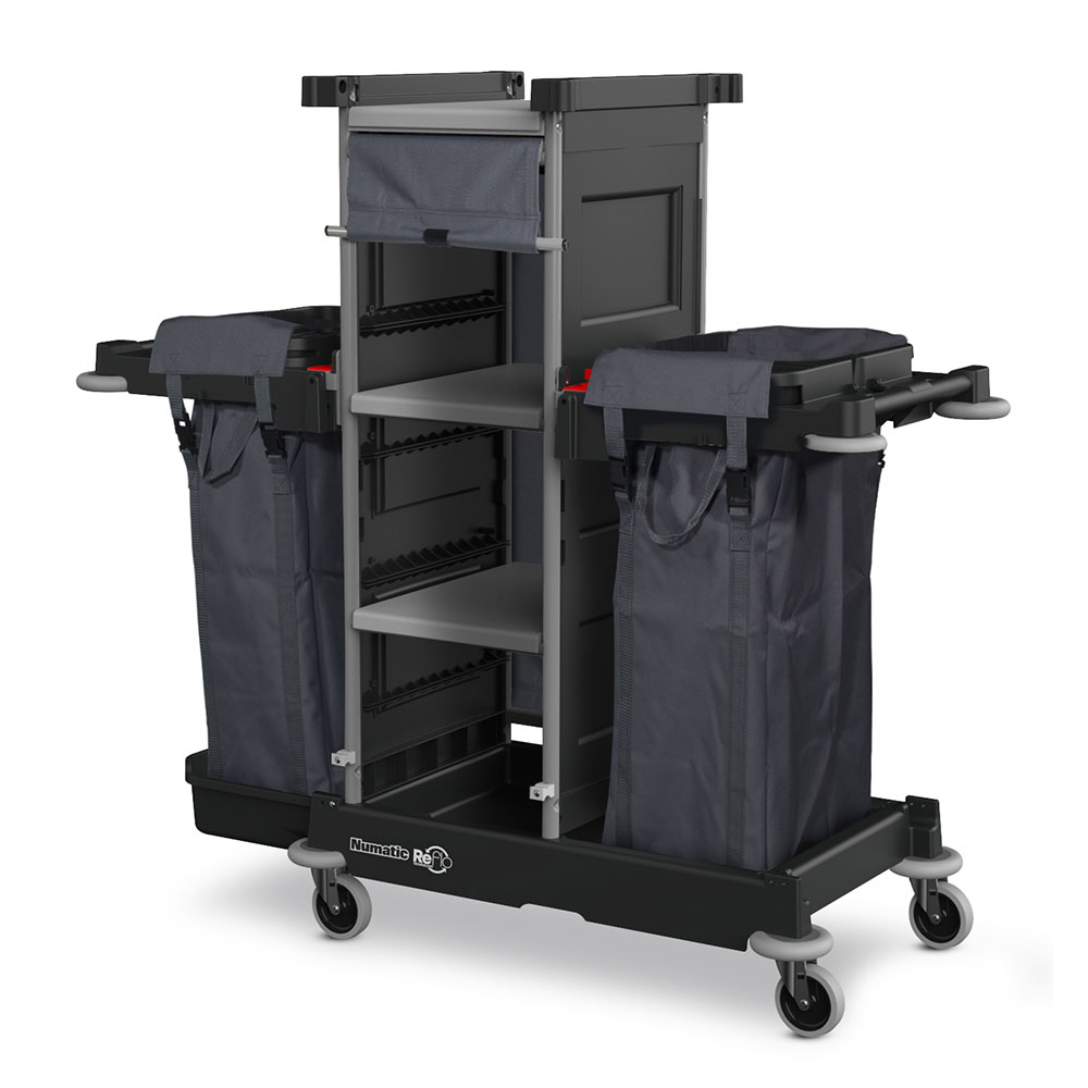 Wielofunkcyjny, wysoki wózek do obsługi hotelowej NKS2R angielskiej marki NUMATIC przeznaczony jest do transportu i przechowywania pościeli, ręczników a także galanterii hotelowej. Precyzyjne, skrętne koła oraz odbojniki zapewniają doskonałą pracę wózka również w niewielkich pomieszczeniach o ograniczonej dostępności np. w wąskich korytarzach, windach czy na podjazdach lub rampach. Worki (2x100L) ulokowane po bokach wózka służą do transportu brudnej pościeli lub ręczników.