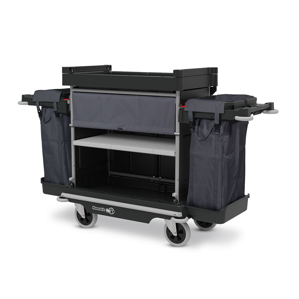 Wielofunkcyjny wózek do obsługi hotelowej NKU32RFF angielskiej marki NUMATIC przeznaczony jest do transportu i przechowywania pościeli, ręczników a także galanterii hotelowej. Duże, skrętne koła zapewniają doskonałą pracę wózka również w niewielkich pomieszczeniach o ograniczonej dostępności np. w wąskich korytarzach czy na podjazdach lub rampach. Worki (2x100L) ulokowane po bokach wózka służą do transportu brudnej pościeli.