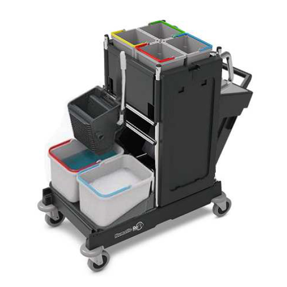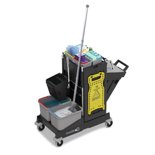 Wszechstronny wózek serwisowy PM10S SRK1 SRK21 angielskiej marki NUMATIC przeznaczony jest do sprzątania np. obiektów sportowych, kompleksów gastronomicznych czy galerii handlowych. Wyposażony jest w wyciskarkę doczołową, wysuwany pojemnik na śmieci, a także 2 komplety wiader o różnej pojemności. Wózek doskonale sprawdza się również w niewielkich pomieszczeniach o ograniczonej dostępności np. w wąskich korytarzach.